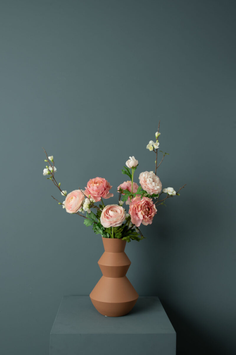 Omdat kunstbloemen niet altijd precies blijven zitten zoals je ze wilt, kun je jouw boeket naar wens restylen. Haal hiervoor alle stelen uit de vaas. Begin met de kortste stelen en plaats ze gekruist in de vaas. Terwijl je de vaas langzaam draait, voeg je de langere stelen toe, zodat er een mooi gelaagd effect ontstaat. Bij smallere vazen hoef je de stelen niet te kruisen; zorg er dan gewoon voor dat ze allemaal op de bodem van de vaas rusten.
